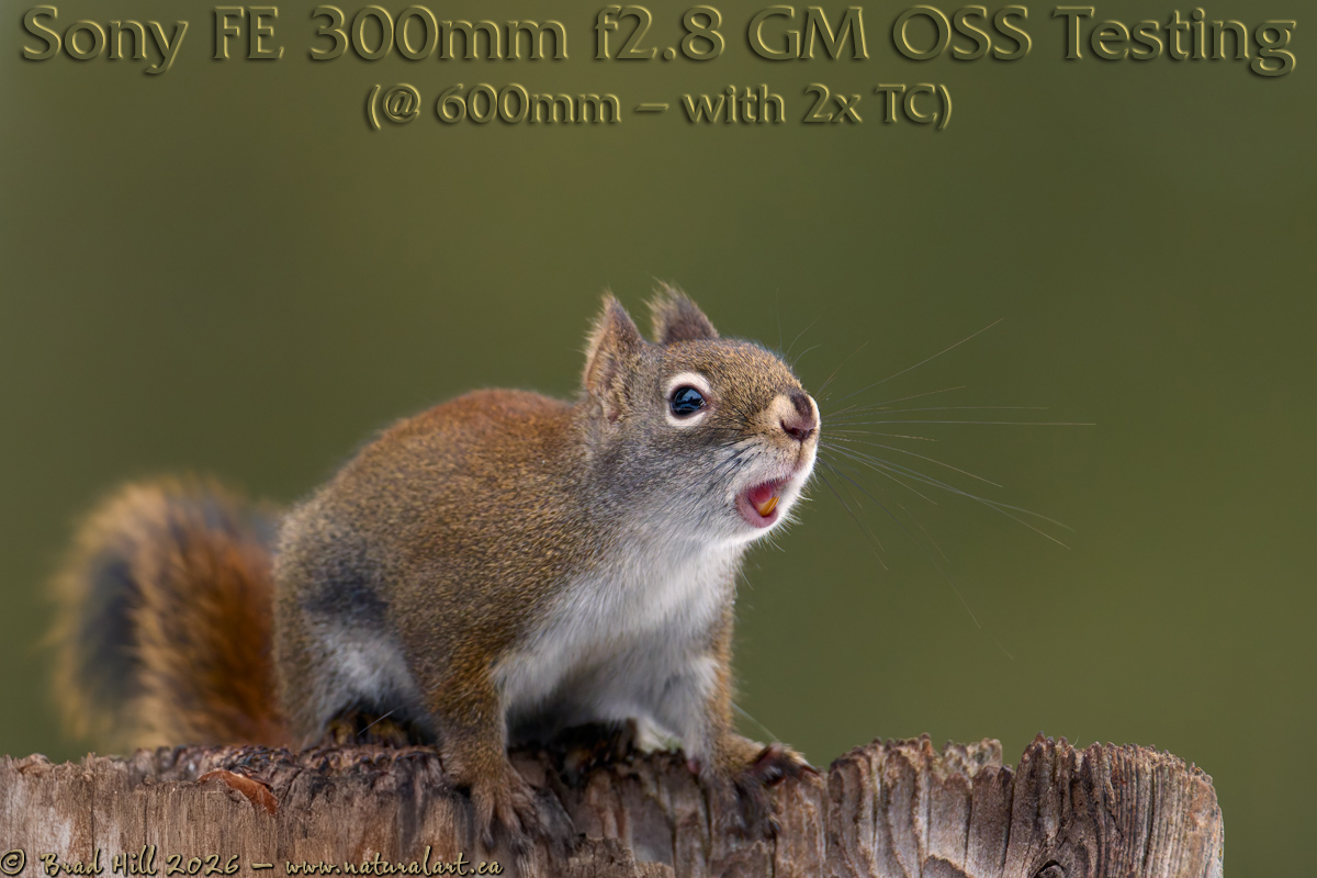 While my favourite wildlife photography subject matter tends to be terrestrial North American carnivores, I still find watching and photographing many other less "charismatic" wildlife species to be both fascinating and highly enjoyable. Red Squirrels rate very highly for me among the "non-carnivore" species to watch and photograph, especially when I'm doing a lot of gear testing. Not only are they conveniently "available" right outside my door (our acreage is covered in wall-to-wall Red Squirrel territories) but they are just super-animated little beasts! This particularly lippy squirrel had just finished chasing another squirrel out of its territory (which are about 1 hectare in size) and stopped to proclaim his or her ownership of this patch of land (both male and female Red Squirrels individually defend territories).